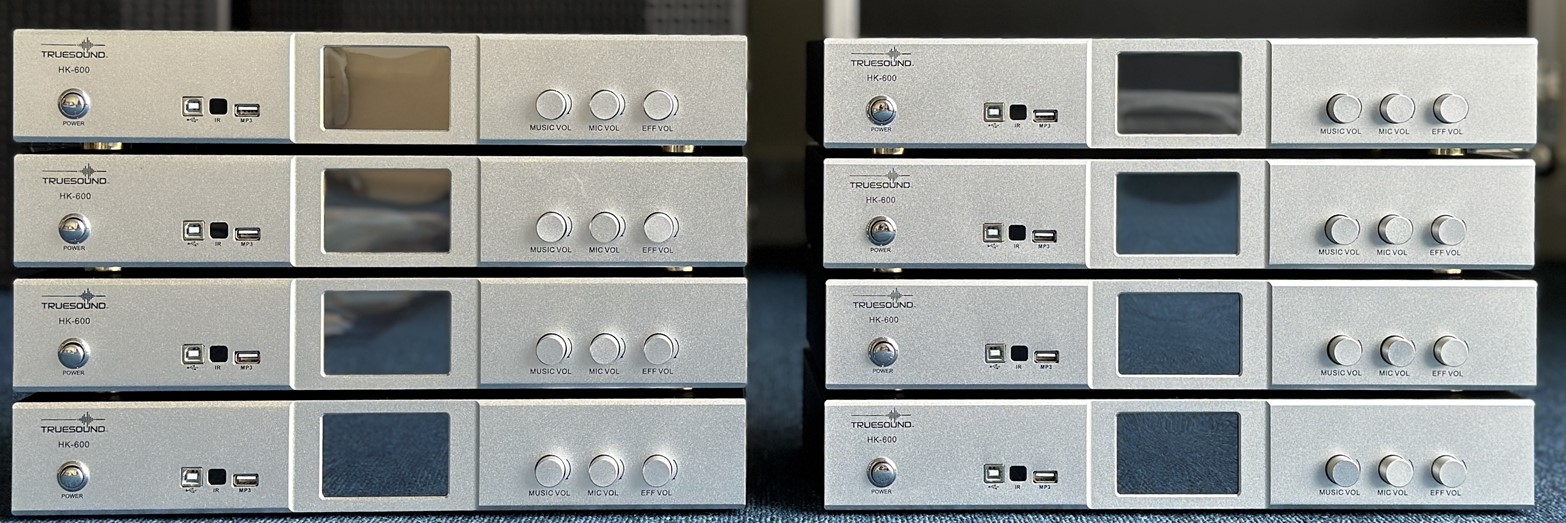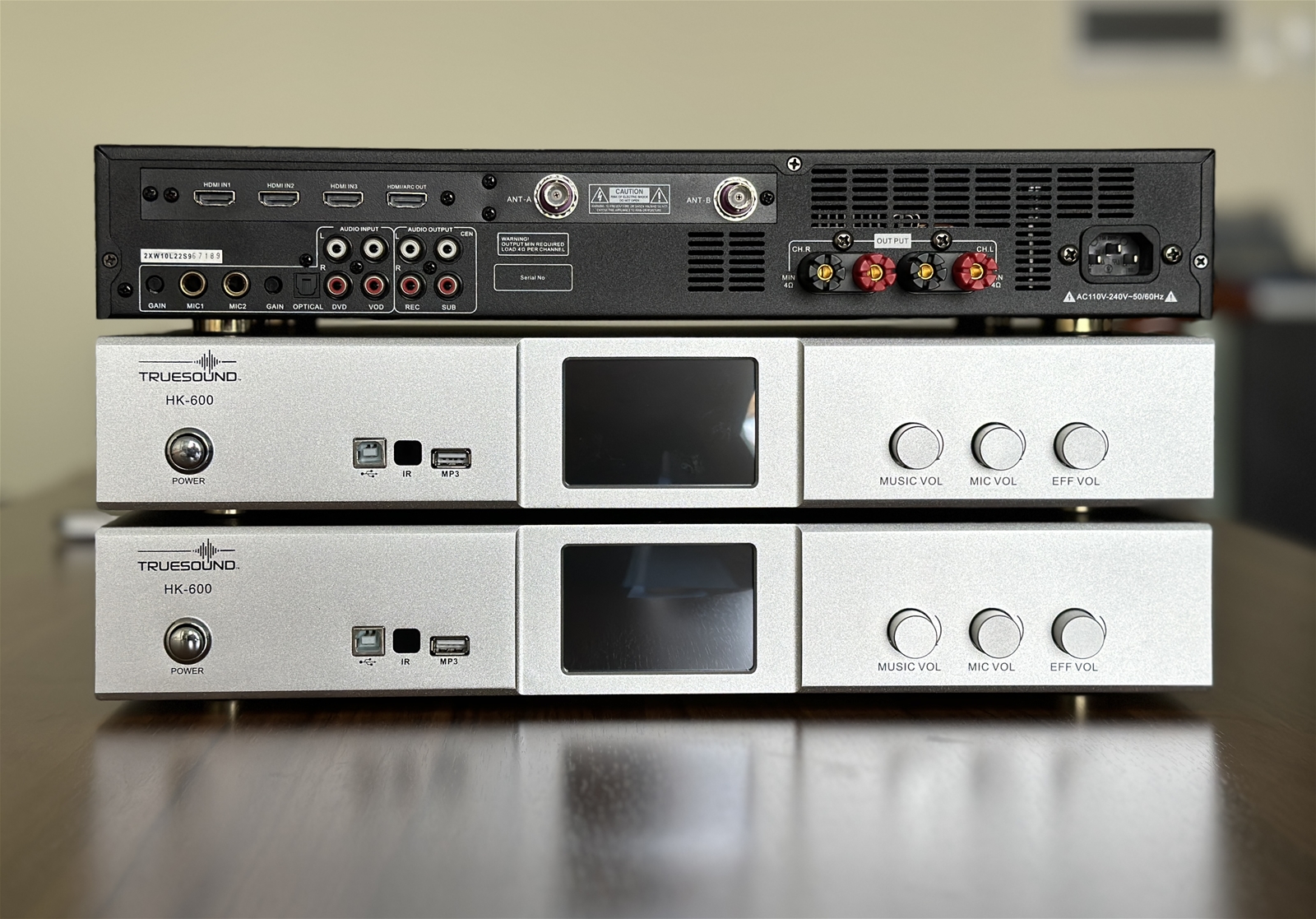 TRUESOUND HK600 - Amply 3 trong 1 liền vang số, mic, công suất. Amply tích hợp liền vang số và Micro không dây có công suất lớn 600W/kênh - thiết kế 2 kênh được các kỹ sư hằng đầu của Châu Âu nghiên cứu và thiết kế mạch công suất nguồn Class D cho tiếng nhạc trong trẻo và tiếng micro mềm mại. Rất phù hợp cho karaoke gia đình.