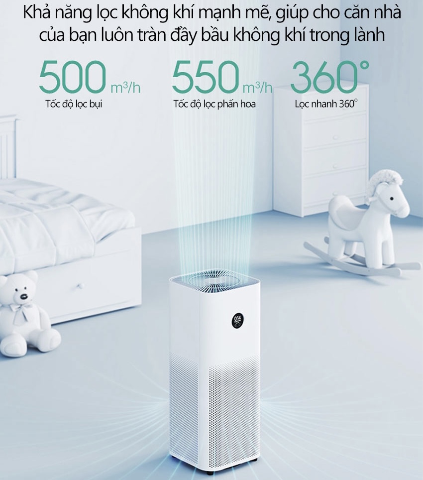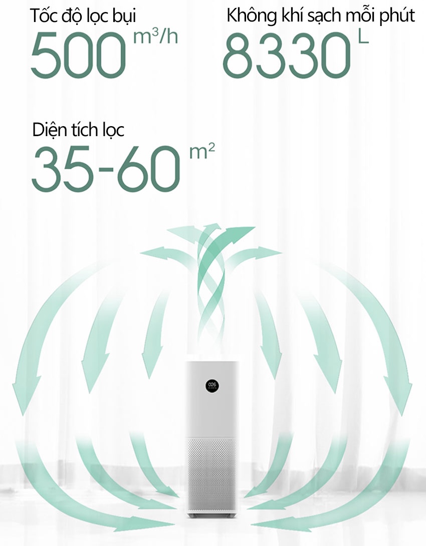 Mi Air Purifier 4 Pro sử dụng động cơ không chổi than hoạt động êm ái, bền bỉ kết hợp hệ thống quạt ly tâm cỡ lớn đạt công suất lọc 8.330 lít không khí sạch mỗi phút, tốc độ lọc CADR cực mạnh mẽ lên đến 500m3/h đáp ứng không gian sử dụng rộng lớn 60m2