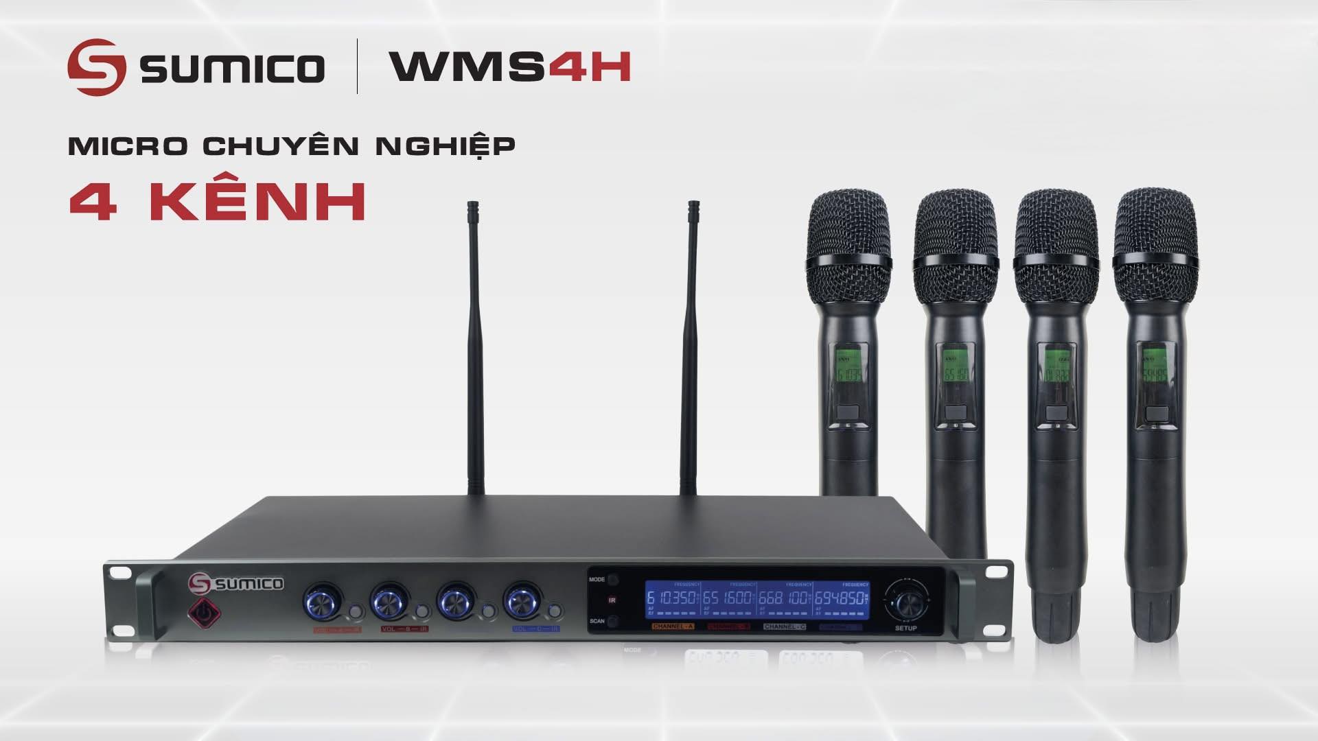 Sumico WMS4H là dòng Micro chuyên nghiệp 4 kênh đến từ hãng Sumico nổi tiếng thế giới. Hệ thống Micro không dây Sumico WMS4H dễ thu hút và gây ấn tượng bởi sự sang trọng trong từng đường nét thiết kế. Phần đầu thu được cấu tạo từ hợp kim chắc chắn. Bên trái đầu thu được in logo hãng Sumico và tên model WMS4H nổi bật. Góc phải đầu thu là màn hình LCD hiển thị thông tin riêng biệt cho 4 kênh kết nối 4 Micro. 2 bên màn hình là các nút xoay vặn hiệu chỉnh cho 4 kênh có đèn led dễ thao tác nhanh trong khu vực thiếu ánh sáng Mặt trước đầu thu có 2 quai nắm kéo, 2 bên mặt đầu thu có quai gắn tủ UI.